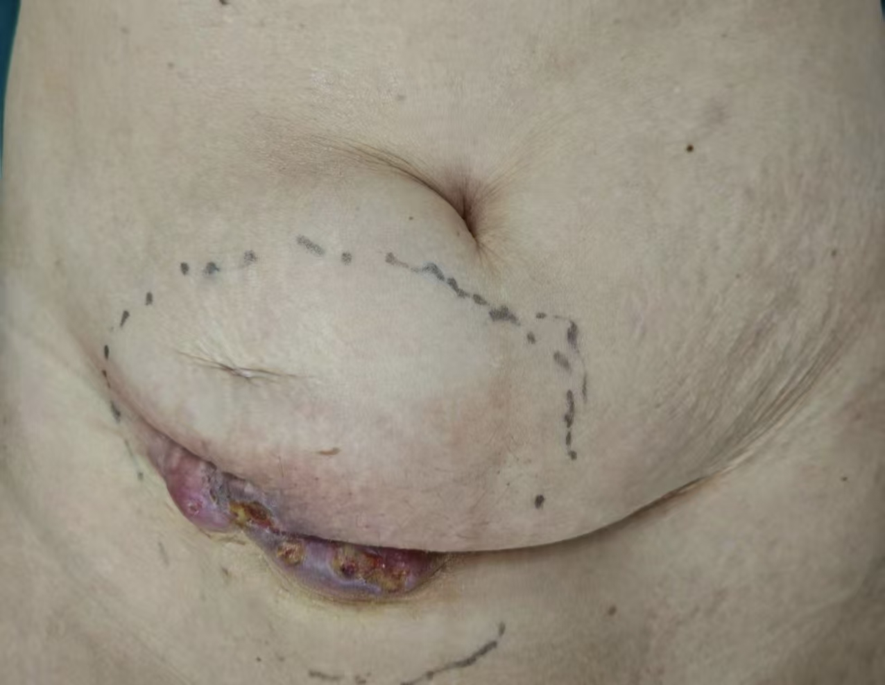 王女士是四川人,19年前在当地医院剖宫产诞下孩子,术后肚子上留下了一条粗疤痕。产后的第三年,她发现每个月这条疤痕会随月经出现胀痛,医院检查后诊断为腹壁内异结节,建议定期随访。王女士当时觉得可能是这条疤没长好,不影响生活,没当回事。之后,疤痕处的肿块逐渐缓慢长大,这一拖就是19年。最近王女士发现这个肿块已有拳头大小,且肿块表面的局部皮肤出现破溃流脓,她才慌了神,赶紧到温医大附二院妇科就诊。