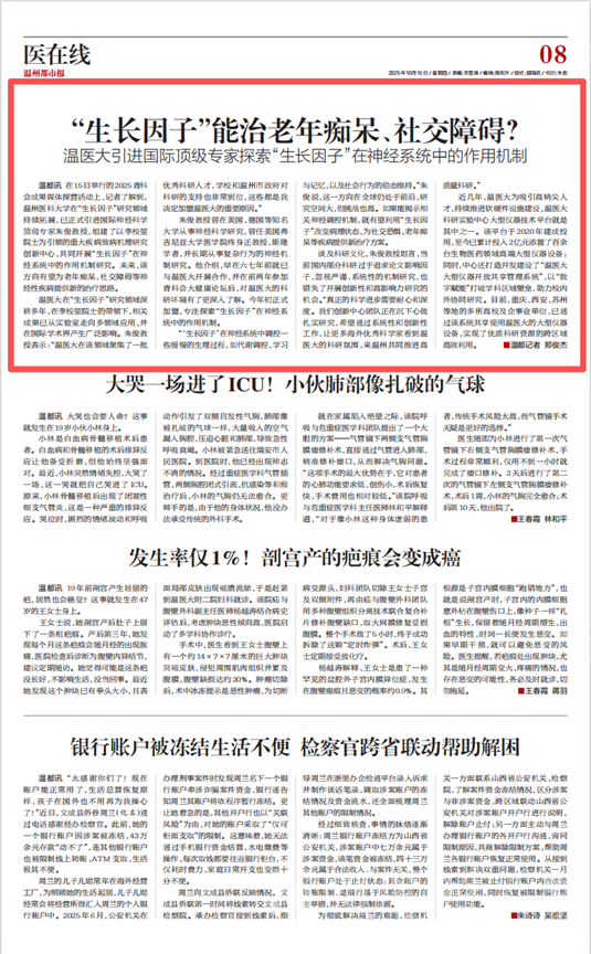 在15日举行的2025青科会成果媒体探营活动上,记者了解到,温州医科大学在“生长因子”研究领域持续拓展,已正式引进国际神经科学顶级专家朱俊教授,组建了以李校堃院士为引领的重大疾病致病机理研究创新中心,共同开展“生长因子”在神经系统中的作用机制研究。未来,该方向有望为老年痴呆、社交障碍等神经性疾病提供新的治疗思路。