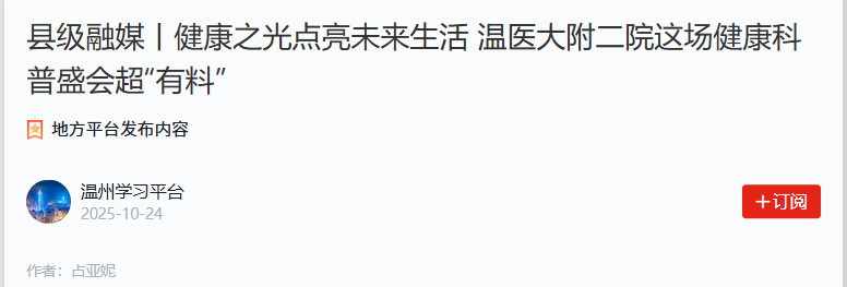 以此次活动为起点,温州医科大学和附属医院将携手温州市医学会医学科普分会成员单位以及各级新闻媒体,把更多的健康科普知识送到社区、送进校园、送达乡村,努力营造热爱科学、崇尚健康的社会风尚。