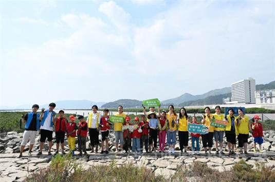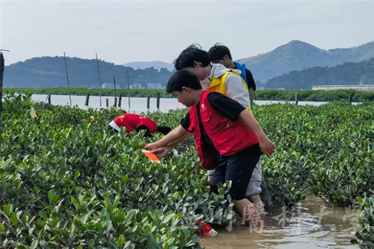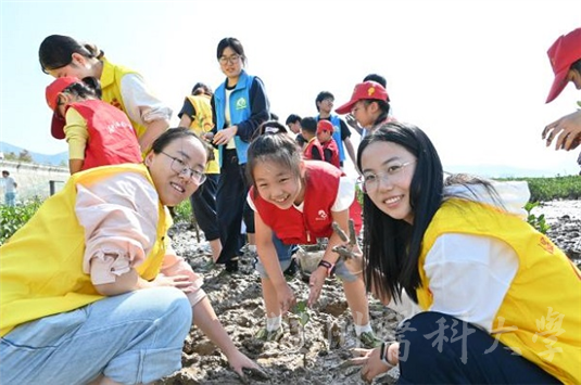 “红树苗什么时候会长高呀?”“它会喜欢这里吗?”滩涂上,小学生们化身为“滩涂园丁”,撸起袖子和裤腿,与本硕博党员志愿者们一道,深一脚浅一脚地踩进柔软的滩涂里,种下一株株红树苗。