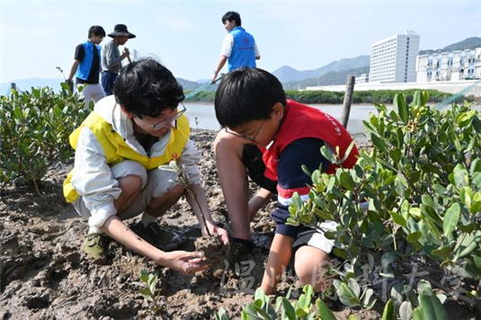 “哥哥,多铲点泥,不能让小树苗歪歪倒倒。”小学生们小心翼翼地扶正稚嫩的红树苗,志愿者则奋力地挥动着小铲,为树苗培上乌黑的泥巴。