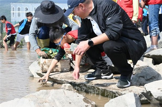 随后,小学生们领取“青蟹习性卡片”及蟹苗,通过任务卡了解青蟹的生活习性后,有序地将它们放归滩涂,并用手机记录下这美好瞬间。