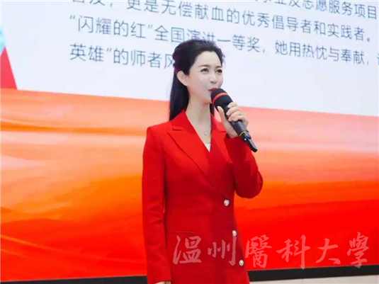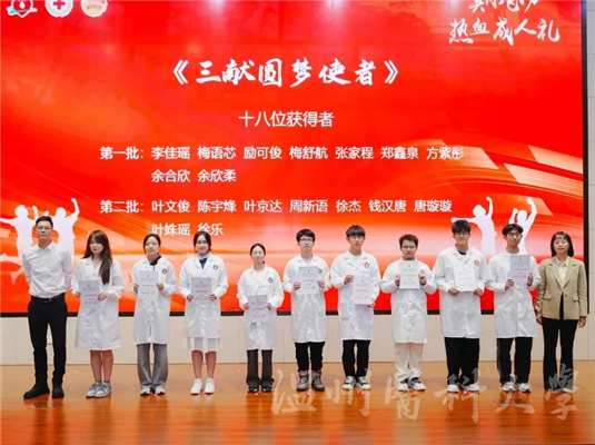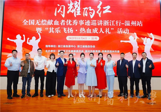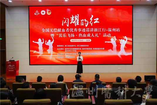 为发挥先进典型的示范引领作用,营造崇尚奉献的热血氛围,11月6日,由浙江省血液中心、浙江省输血协会指导,温州市卫生健康委员会、温州市教育局、共青团温州市委、温州市红十字会主办,温州市中心血站、共青团温州医科大学委员会承办的“闪耀的红——全国无偿献血者优秀事迹巡讲浙江行”温州站暨“其乐飞扬 热血成人礼”活动在温州医科大学茶山校区隆重举行,中国输血协会提供活动支持。
