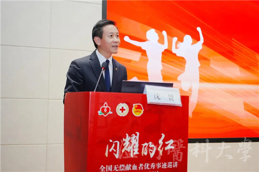 沈贤副校长为本次活动致欢迎辞,他对青年学子参与无偿献血的积极性给予肯定,鼓励青年以“三献”行动践行成人责任,为社会贡献青春力量。