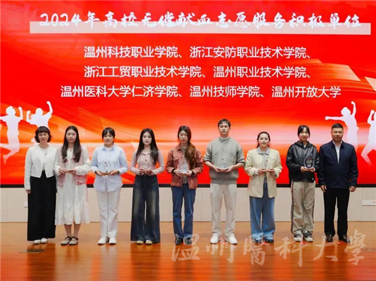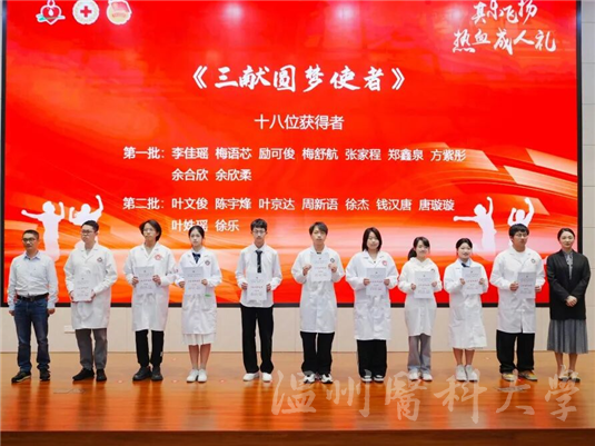 为感谢各高校长期以来对无偿献血工作的支持与配合,现场为2024在温高校无偿献血志愿服务爱心单位、积极单位颁发水晶杯,并为“三献”志愿者代表授予“三献圆梦使者”称号。