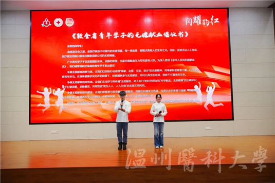 一声誓言,满腔热血。温州医科大学的学生代表共同宣读了《致全省青年学子的无偿献血倡议书》并宣誓,以青春之声呼吁广大青年学子以实际行动践行社会责任,传递生命希望。