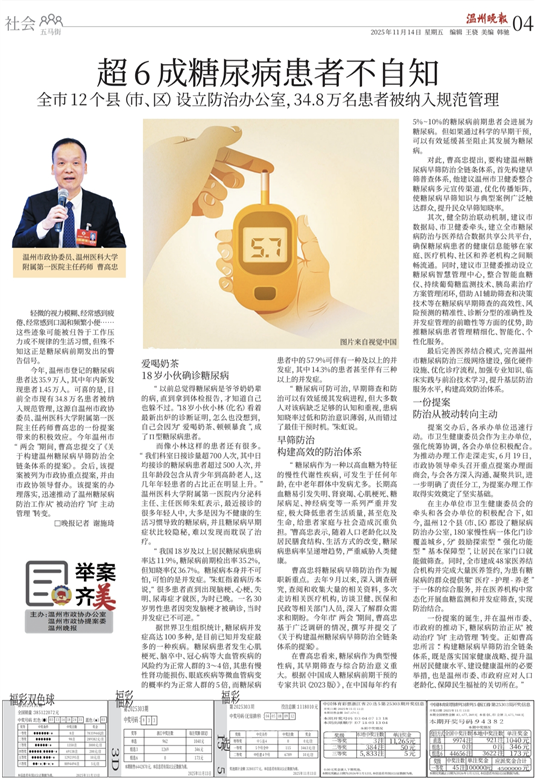 一份提案的诞生,并在温州市委、市政府的推动下,糖尿病防治正从“被动治疗”向“主动管理”转变。正如曹高忠所言:“构建糖尿病早筛防治全链条体系,既是落实国家健康战略、提升温州居民健康水平、建设健康温州的必要举措,也是温州市委、市政府应对人口老龄化、保障民生福祉的关切所在。”