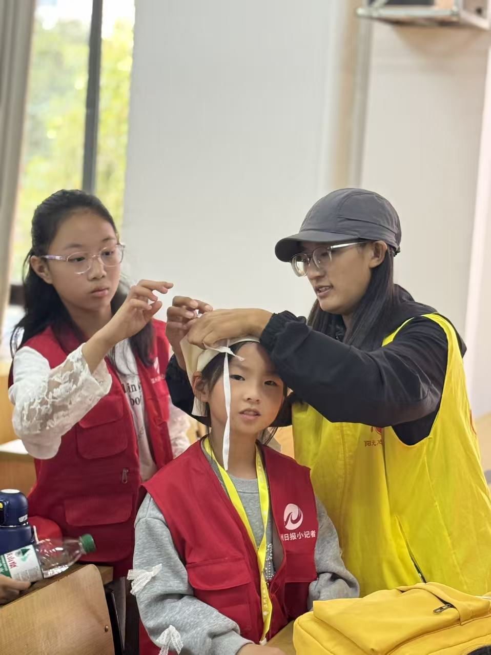 在志愿者的带领下,小记者们参加了实用的急救课堂,志愿者周勇翰向小记者们演示了急救方法。在周勇翰的带领下,小记者们认真学习心肺复苏、伤口包扎、石头剪刀布定位法和海姆立克急救法等知识,并在志愿者们的指导下操作三角巾包扎法,感悟着“时间就是生命”的沉重与担当。小记者叶含章说,“通过志愿者哥哥姐姐们教授,我对急救知识的了解又进了一步!”