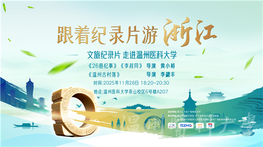 2025年11月28日晚,温州医科大学人文艺术教育课堂座无虚席,“跟着纪录片游浙江”系列活动走进温州医科大学,来自浙江广电集团资深纪录片总导演黄小裕、温州市新闻传媒中心纪录片导演李勰丰,受邀与师生们分享文旅纪录片的创作心路与艺术追求,引领大家进行了一场跨越时空的光影心灵对话。