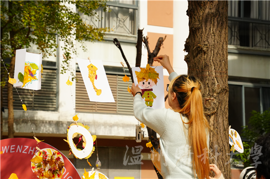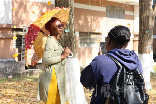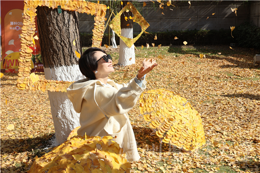 活动筹备阶段,工作人员精心收集并整理了梧桐、枫树、银杏等各类自然落叶,将其转化为充满艺术潜力的创作素材。打卡区布置别具匠心:五彩落叶与麻绳、木棒、透明胶带巧妙组合,制成随风轻响的落叶风铃;两侧错落有致的落叶装饰与缠绕其间的暖光串灯交相辉映,营造出静谧而浪漫的氛围。打卡点内,由落叶拼贴而成的银杏伞、立体相框等装置栩栩如生,搭配松软的落叶堆与造型独特的枯枝,迅速成为师生争相合影的“网红地标”。驻足于此的同学们纷纷感叹:“温医大的银杏也太美了吧!”“今年的银杏拥有了新皮肤!”“学校老师也太有创意了!”一张张笑脸、一次次快门,定格下人与自然的美好邂逅。