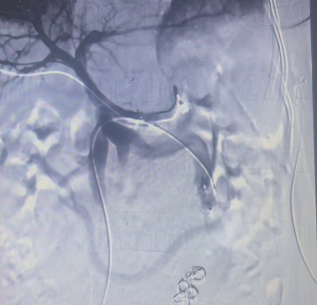 明确诊断后,介入医学科团队决定用微创介入手术帮王阿姨解决问题。手术在局部麻醉下进行,医生先穿刺股静脉做左肾静脉造影,没找到明确的畸形血管;又改行经皮肝穿刺门静脉,顺着脾静脉、肠系膜上静脉造影,终于看清了那团迂曲扩张的畸形血管团。