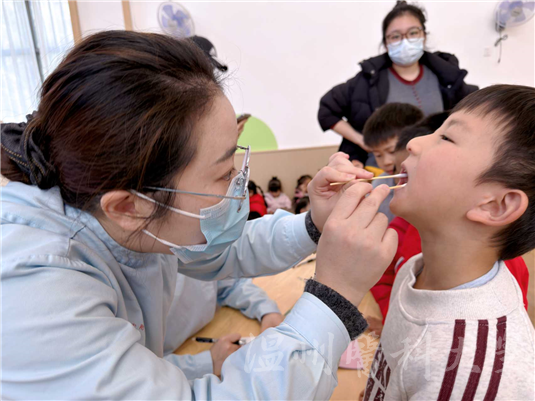 温医大附属口腔医院志愿者为孩子们检查牙齿。