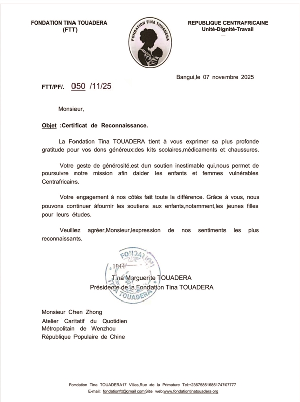 温都讯 近日,中非共和国总统夫人蒂娜·图瓦德拉向温州都市报陈忠慈善工作室、瓯海区慈善总会、瓯海区人民教育基金会、温州曙光中西医创面修复医院院长陈善亮、温州市慈善总会秘书长李武、温州医科大学附属第一医院医务部主任暨玲等发来感谢信,感谢以上单位和个人慷慨捐赠了100多万元文具、鞋子、药品等爱心物资,帮助了中非共和国的弱势儿童和妇女。