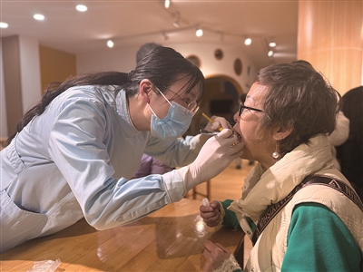 讲座结束后,曾丽君请老人们依次上前,进行口腔检查。