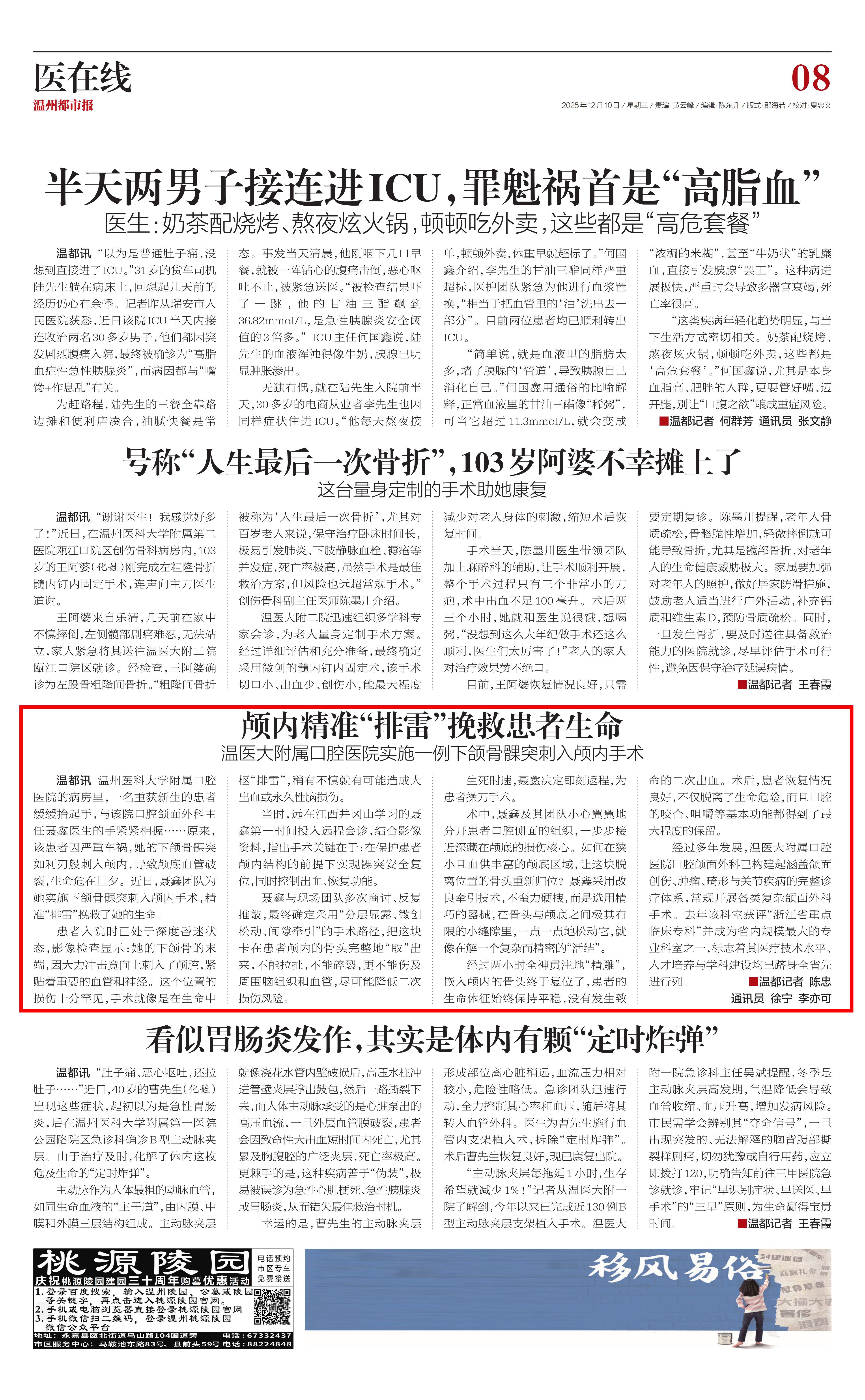 经过多年发展,温医大附属口腔医院口腔颌面外科已构建起涵盖颌面创伤、肿瘤、畸形与关节疾病的完整诊疗体系,常规开展各类复杂颌面外科手术。去年该科室获评“浙江省重点临床专科”并成为省内规模最大的专业科室之一,标志着其医疗技术水平、人才培养与学科建设均已跻身全省先进行列。■温都记者 陈忠
