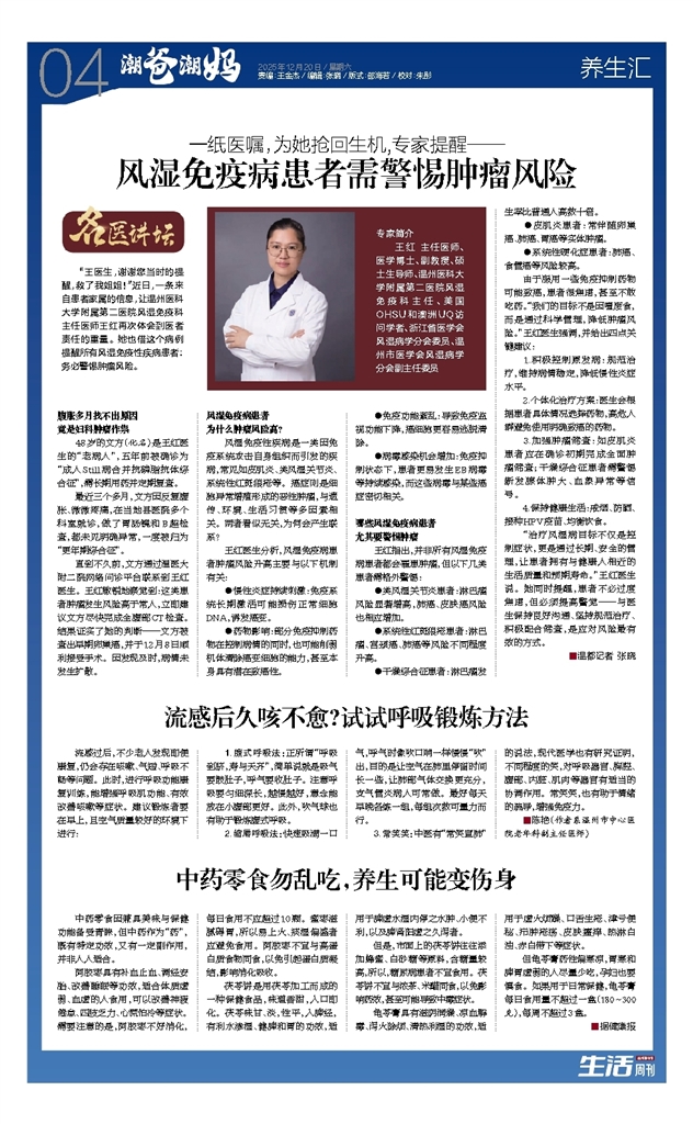 “王医生,谢谢您当时的提醒,救了我姐姐!”近日,一条来自患者家属的信息,让温州医科大学附属第二医院风湿免疫科主任医师王红再次体会到医者责任的重量。她也借这个病例提醒所有风湿免疫性疾病患者:务必警惕肿瘤风险。
