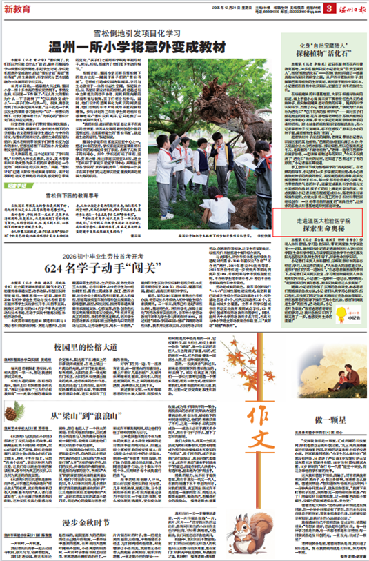 本报讯 (记者 瞿含张 通讯员 钟婷 章书含) 参观人体科普馆、学习急救知识、零距离接触大学实验室……近日,温州日报小记者走进温州医科大学检验医学院(生命科学学院),在该学院实验教学平台党支部及阳光志愿服务队师生的引导下,探索生命医学知识。