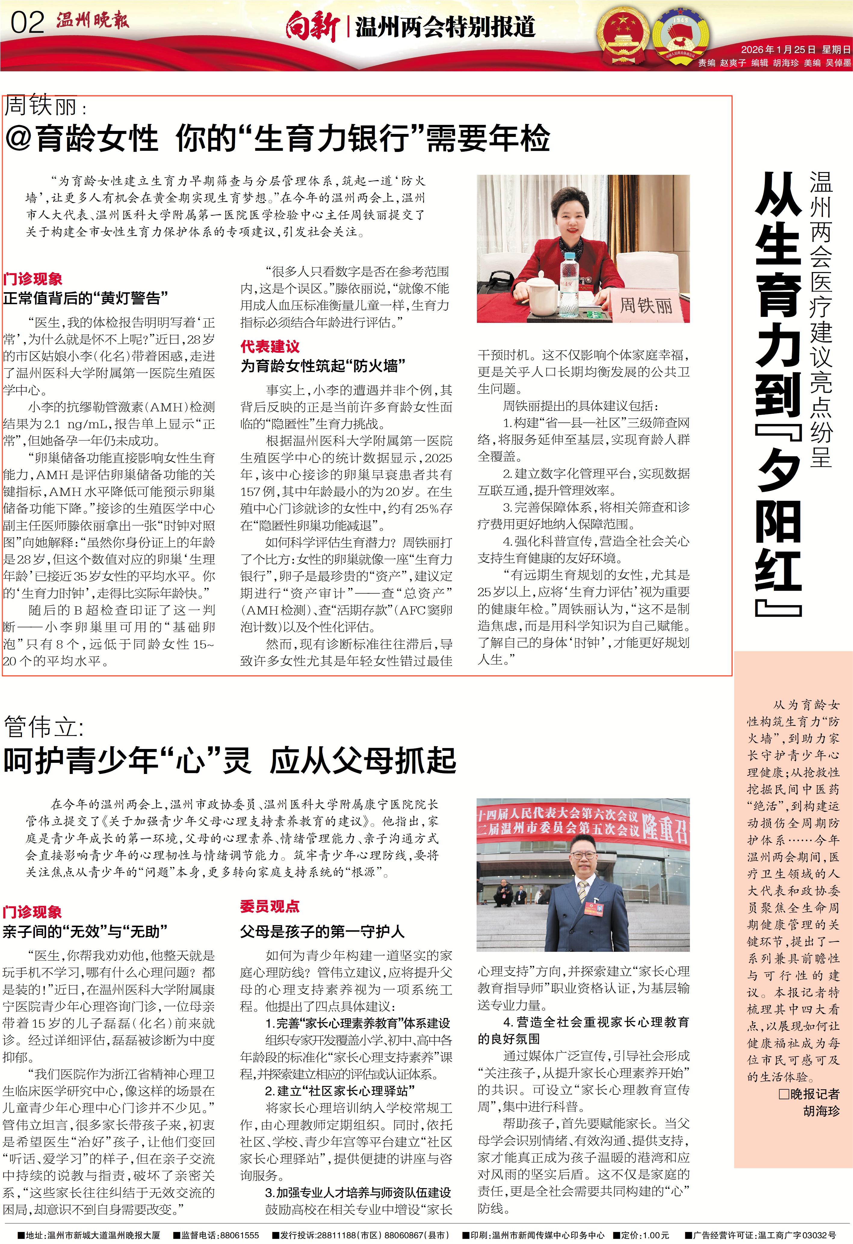 “为育龄女性建立生育力早期筛查与分层管理体系,筑起一道‘防火墙’,让更多人有机会在黄金期实现生育梦想。”在今年的温州两会上,温州市人大代表、温州医科大学附属第一医院医学检验中心主任周铁丽提交了关于构建全市女性生育力保护体系的专项建议,引发社会关注。