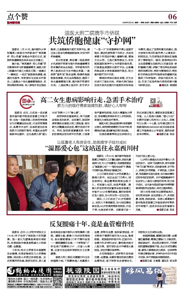 协议的签署,象征着一座连接家乡优质医疗资源与海外侨胞健康需求的专属桥梁由此架起。市侨联相关负责人就深化双方合作提出希望:一是深耕“爱侨宝”服务品牌,畅通侨胞就医绿色通道,优化全流程服务,提供个性化健康管理方案,提升医疗资源可及性。二是拓展公益关怀,针对侨乡“一老一少”及困难群体开展公益医疗服务,推动优质资源下沉侨乡,并在华裔青少年活动中融入健康科普,增强文化认同。三是汇聚资源合力,依托医院国际医学中心与侨联网络优势,打造高品质国际化医疗平台,让温籍侨胞在家乡享受高端医疗服务,助力温州医疗对外开放。