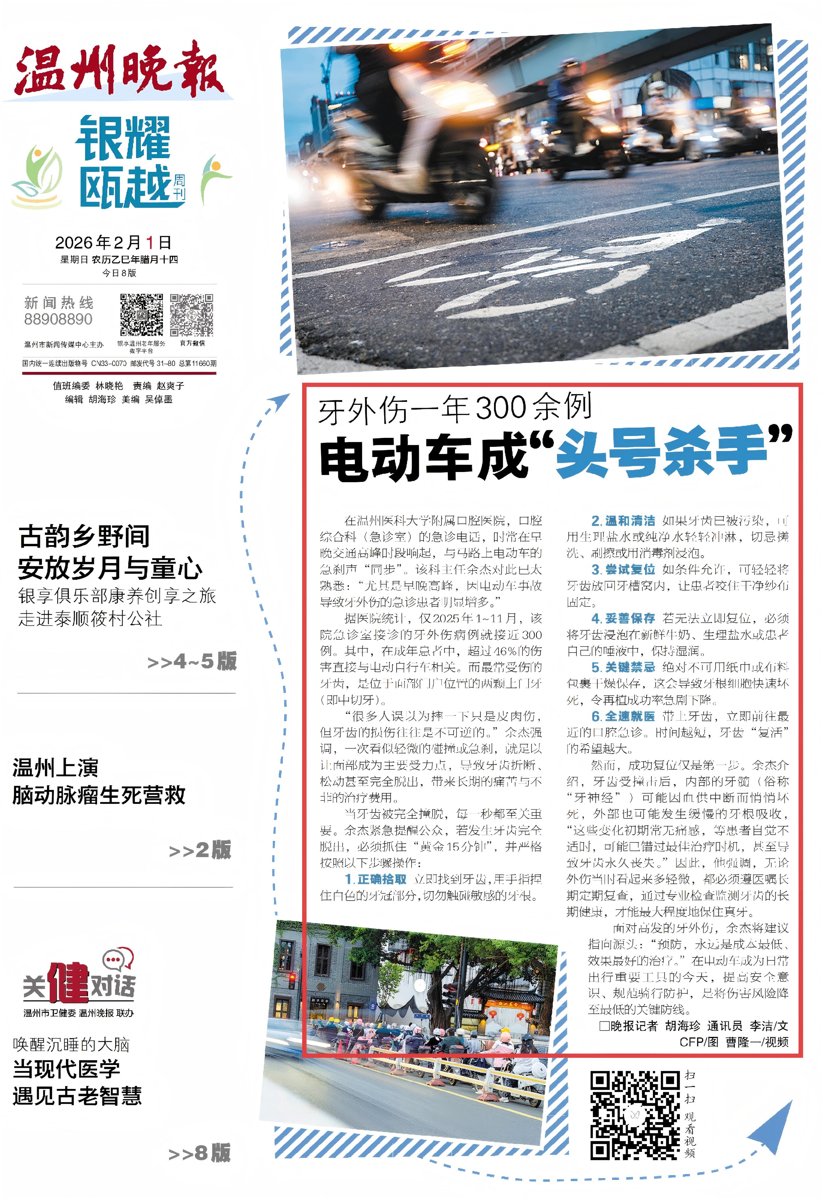 在温州医科大学附属口腔医院,口腔综合科(急诊室)的急诊电话,时常在早晚交通高峰时段响起,与马路上电动车的急刹声“同步”。该科主任余杰对此已太熟悉:“尤其是早晚高峰,因电动车事故导致牙外伤的急诊患者明显增多。”