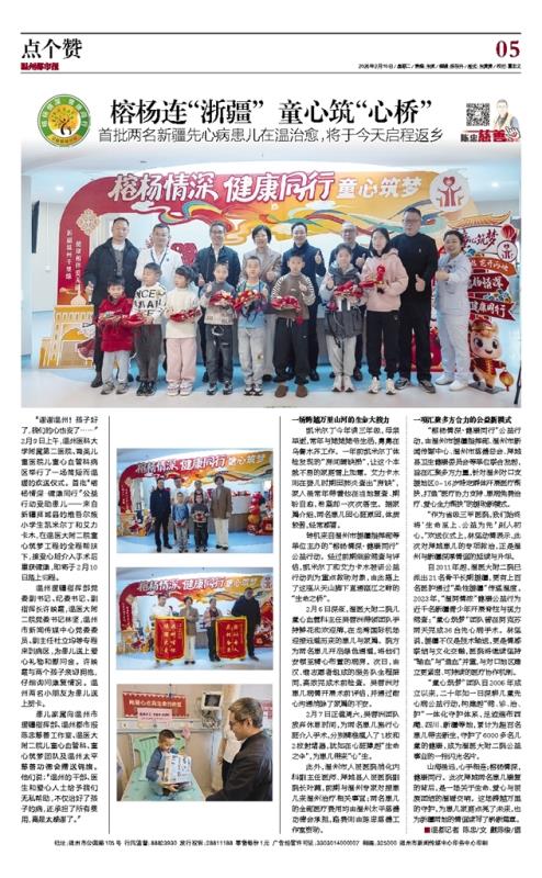 “榕杨情深·健康同行”公益行动,由温州市援疆指挥部、温州市新闻传媒中心、温州市慈善总会、拜城县卫生健康委员会等单位联合发起,旨在汇聚多方力量,针对温州对口支援地区0~16岁特定群体开展医疗帮扶,打造“医疗协力支持、患病免费治疗、爱心全力帮扶”的援助新模式。