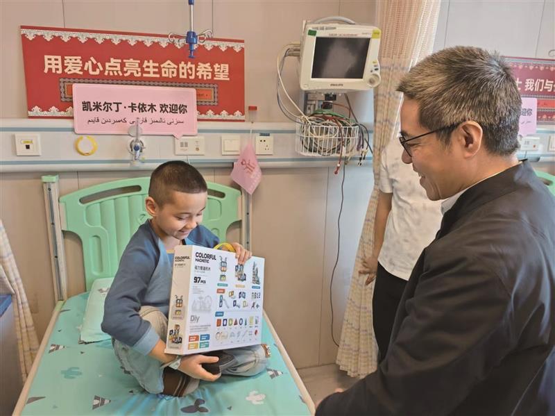 温州援疆指挥部党委副书记、纪委书记、副指挥长许映霞,温医大附二院党委书记林坚,温州市新闻传媒中心党委委员、副主任杜立均等专程来到病区,为患儿送上爱心礼物和慰问金。许映霞与两个孩子亲切拥抱,仔细询问康复情况。温州两名小朋友为患儿送上贺卡。