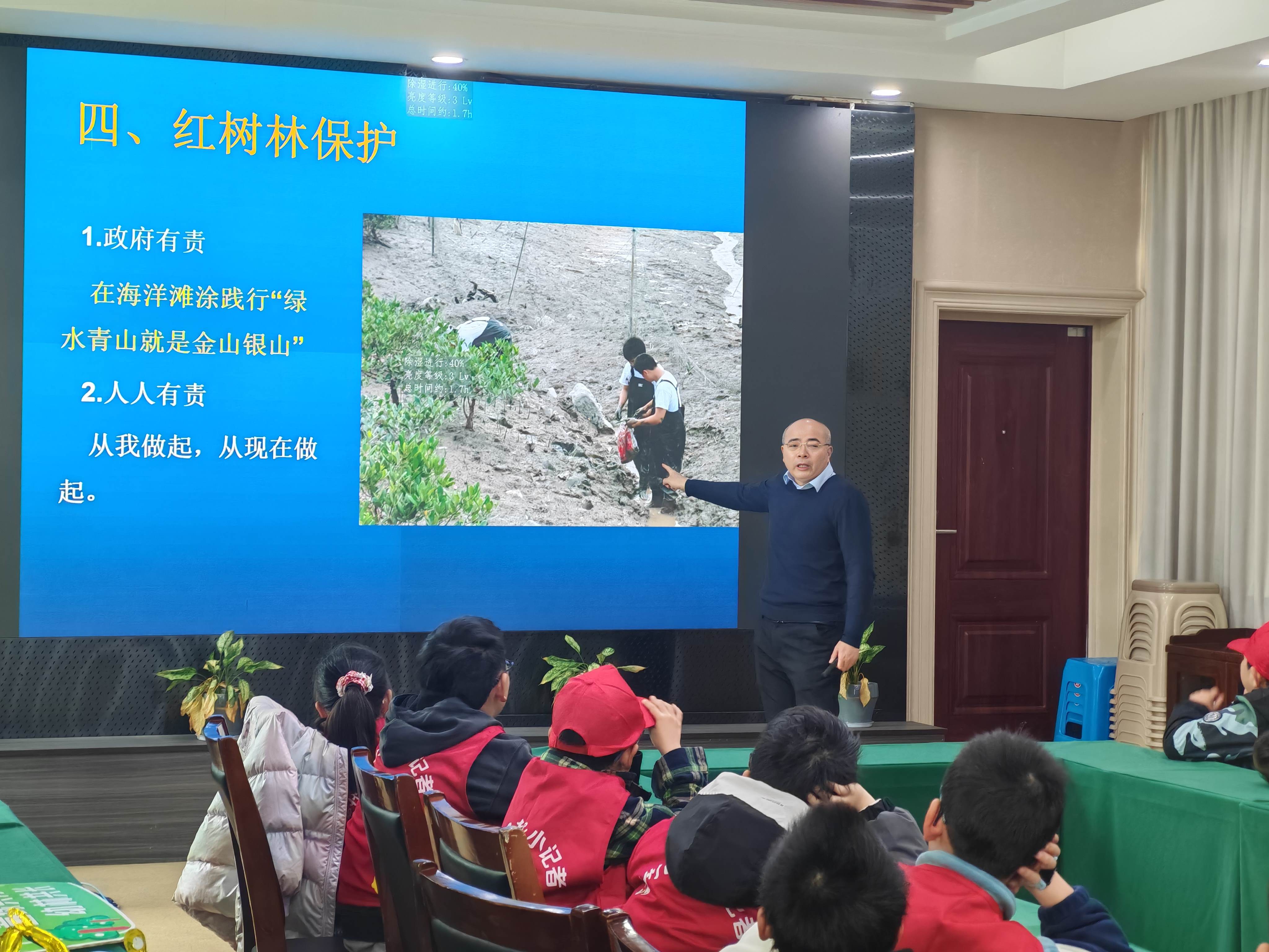 “红树林是分布在热带、亚热带海湾、河口的一类常绿灌木和小乔木群落,位于潮间带,是陆地向海洋过渡的地带,具备‘地球绿肺’、‘地球之肾’、鸟类天堂、海洋生物家园、人类休憩地等多重生态功能。温州红树林于1958年在乐清西门岛首次引种,2005年西门岛获批国家级海洋特别保护区,是温州红树林发展的重要节点。”活动上,来自温医大检验医学院(生命科学学院)艾为明副教授小记者们开展红树林科普,“红树林还能为尖锥拟蟹守螺、长足长方蟹等大型底栖动物提供生存环境,对重金属治理效果良好,还能改善微生物群落、降解有机污染物。”他还向小记者们详细介绍红树林的生态价值、弹涂鱼等伴生生物的生存智慧。大学生志愿者们则为小记者讲解育苗知识,生动解析种子选种技巧、幼苗培育的关键要点,并在种植前,引导小记者们填写红树苗认领卡,写下姓名与环保寄语,许下守护自然、呵护生态的美好心愿。