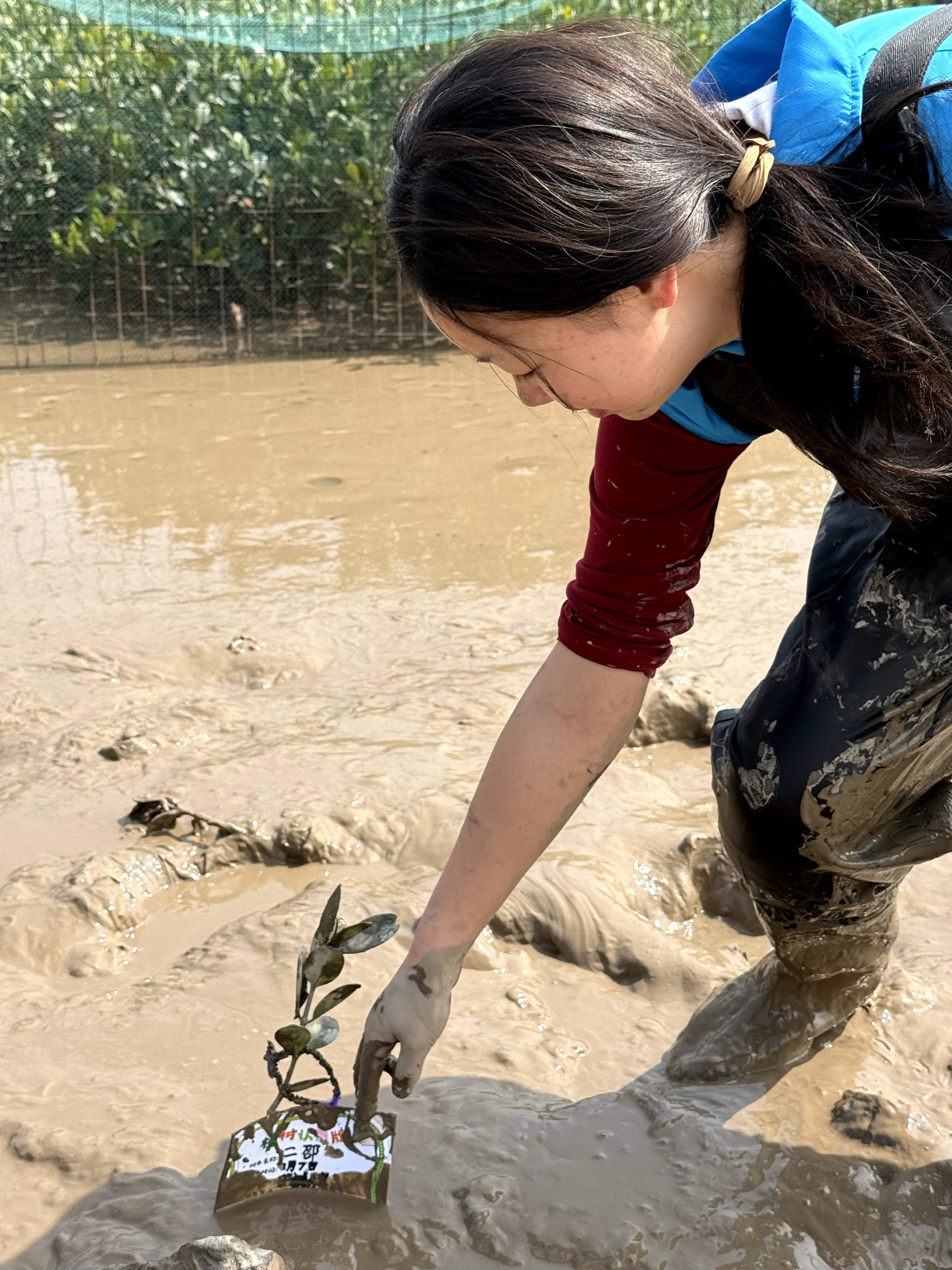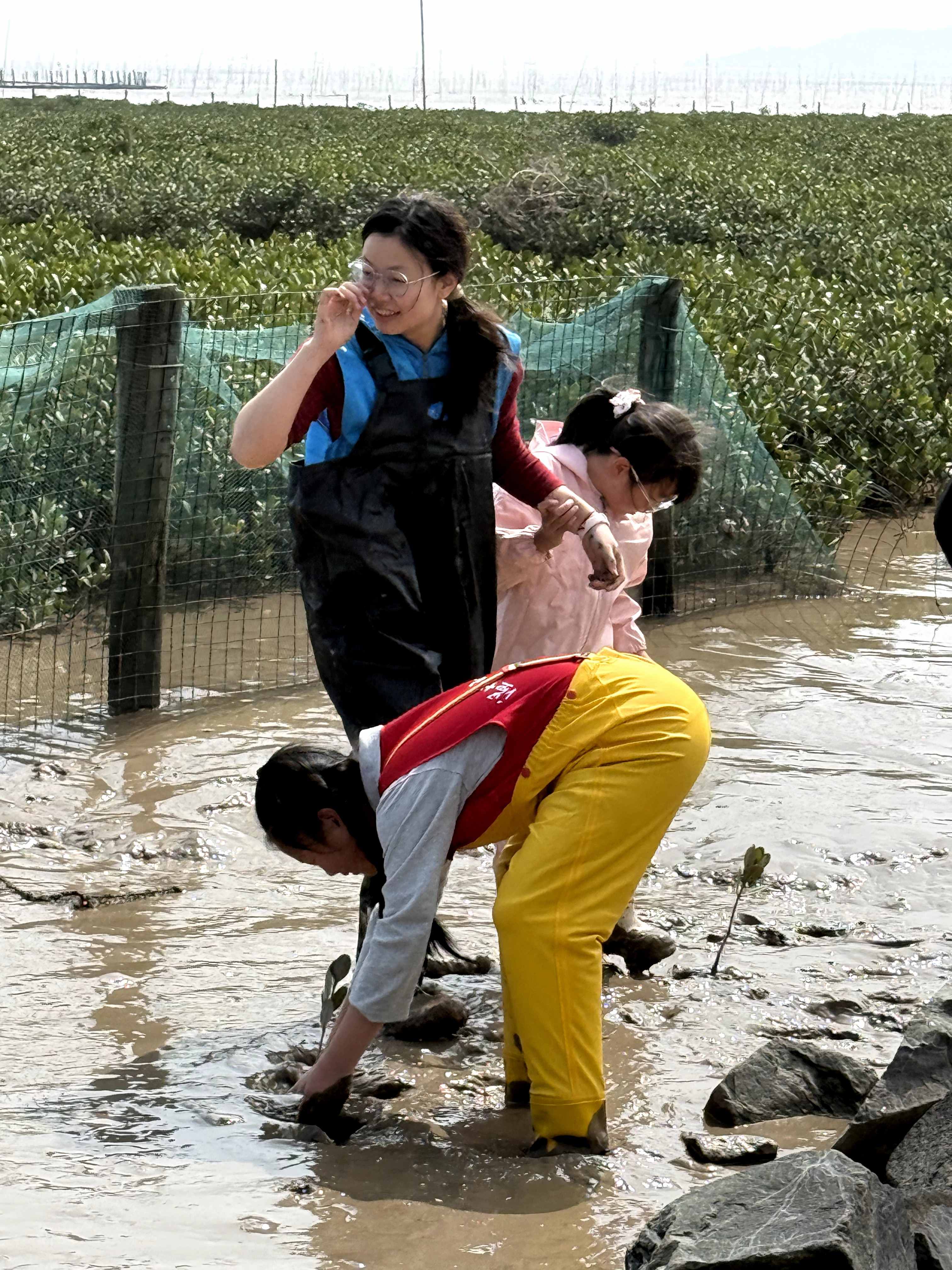 挖坑、扶苗、培土……小记者们在大学生志愿者的带领下,走进红树林种植基地,亲手栽种红树苗。“挖坑要浅一点,刚好没过树苗根须就好。”一旁的大学生志愿者化身“种植导师”,手把手陪伴教授。虽然小记者们的指尖沾染泥土,但丝毫不影响他们种植的热情,他们以专注的态度认真完成每一个步骤。一株株稚嫩却挺拔的红树苗,在滩涂上迎风伫立,为海岸线添上了一抹清新的绿意。