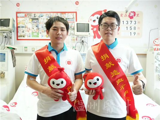 近日,在温州医科大学附属第一医院造血干细胞采集室内,温州医科大学第一临床医学院(信息与工程学院)2023级临床医学(新医科班)学生叶文俊与第二临床医学院2021级临床医学专业学生黄伟豪,先后完成了造血干细胞捐献,成为全校第48、49例,温州市第157、158例造血干细胞捐献者。