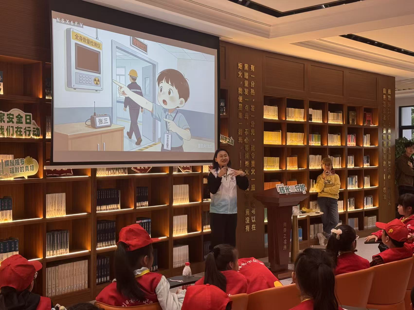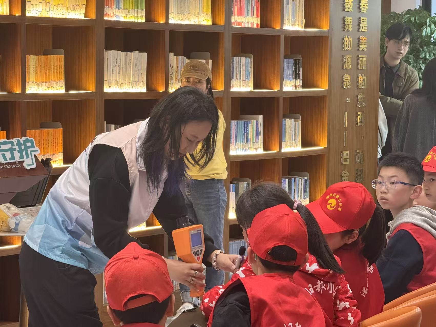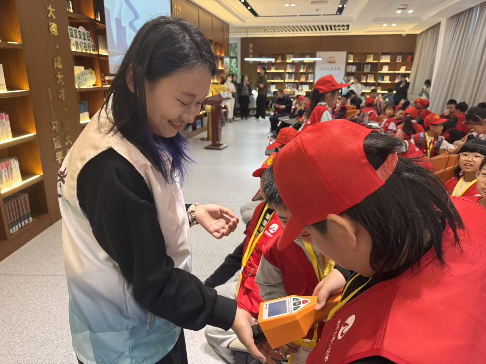 “如果核弹爆炸,该躲进河里还是地下室?”“辐射的标志长什么样?”……她还向小记者们普及了核应急要点:遇核与辐射紧急情况,应迅速进入地下室等掩蔽场所,至少留守24小时,并通过收音机等渠道获取官方指令,做好个人防护,服从统一指挥。活动当天,现场还设置了趣味辐射测量互动,志愿者们带领小记者使用专业仪器,对手机、大理石、矿泉水、香蕉等身边常见物品进行辐射检测,用直观数据揭开辐射的神秘面纱,让小记者们在实践中树立科学的核安全观念。